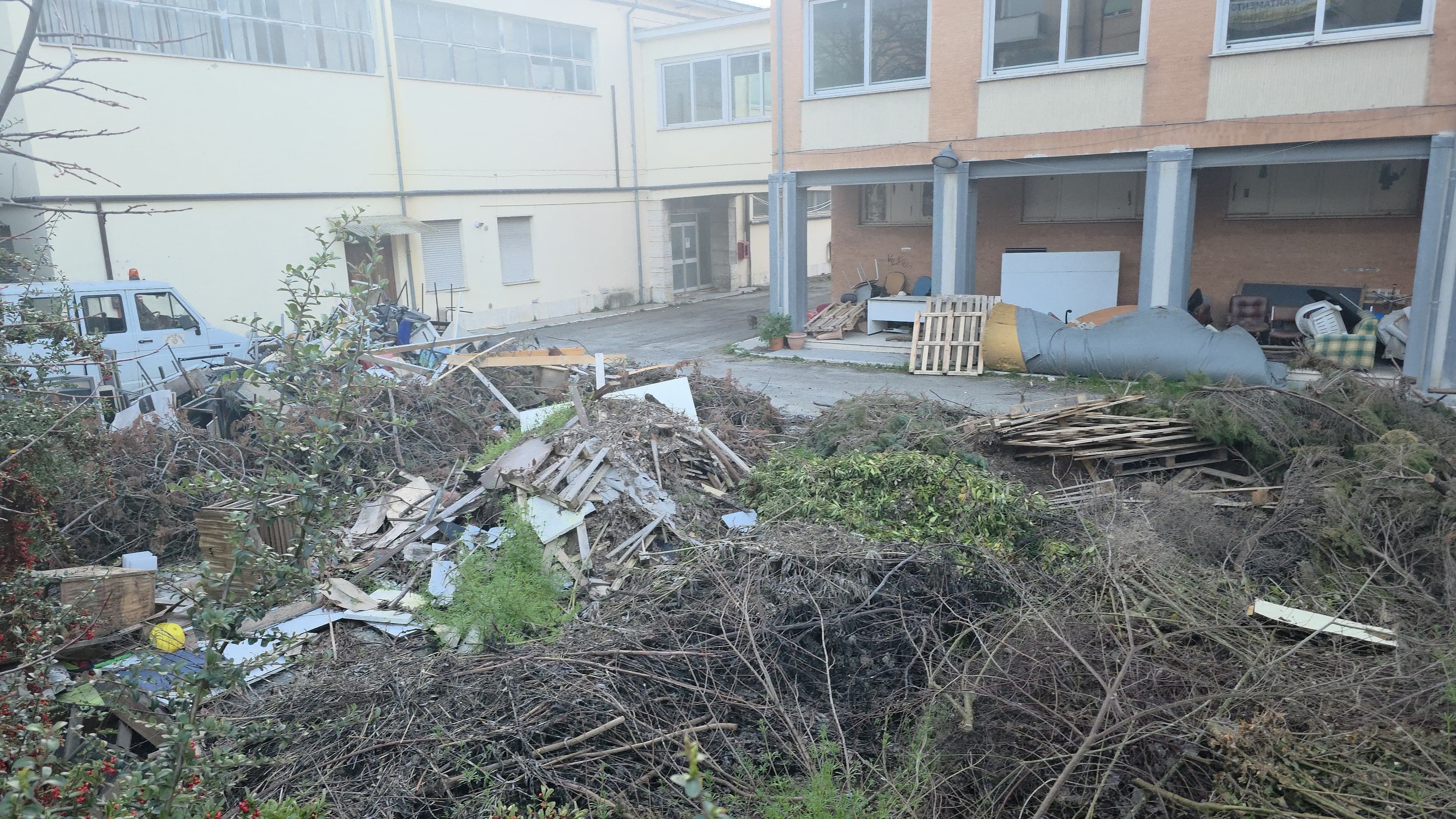 Un vero e proprio magazzino a cielo aperto che racconta la parabola di un edificio scolastico chiuso e lasciato a se stesso. Il legno, accatastato in grandi quantità, solleva interrogativi non solo sul degrado ma anche sui possibili rischi, a partire da quello di incendio. Intanto, nell’area, da settimane proseguono potature e interventi sul verde: operazioni che alimentano ulteriori domande sulla gestione e sui controlli effettuati.